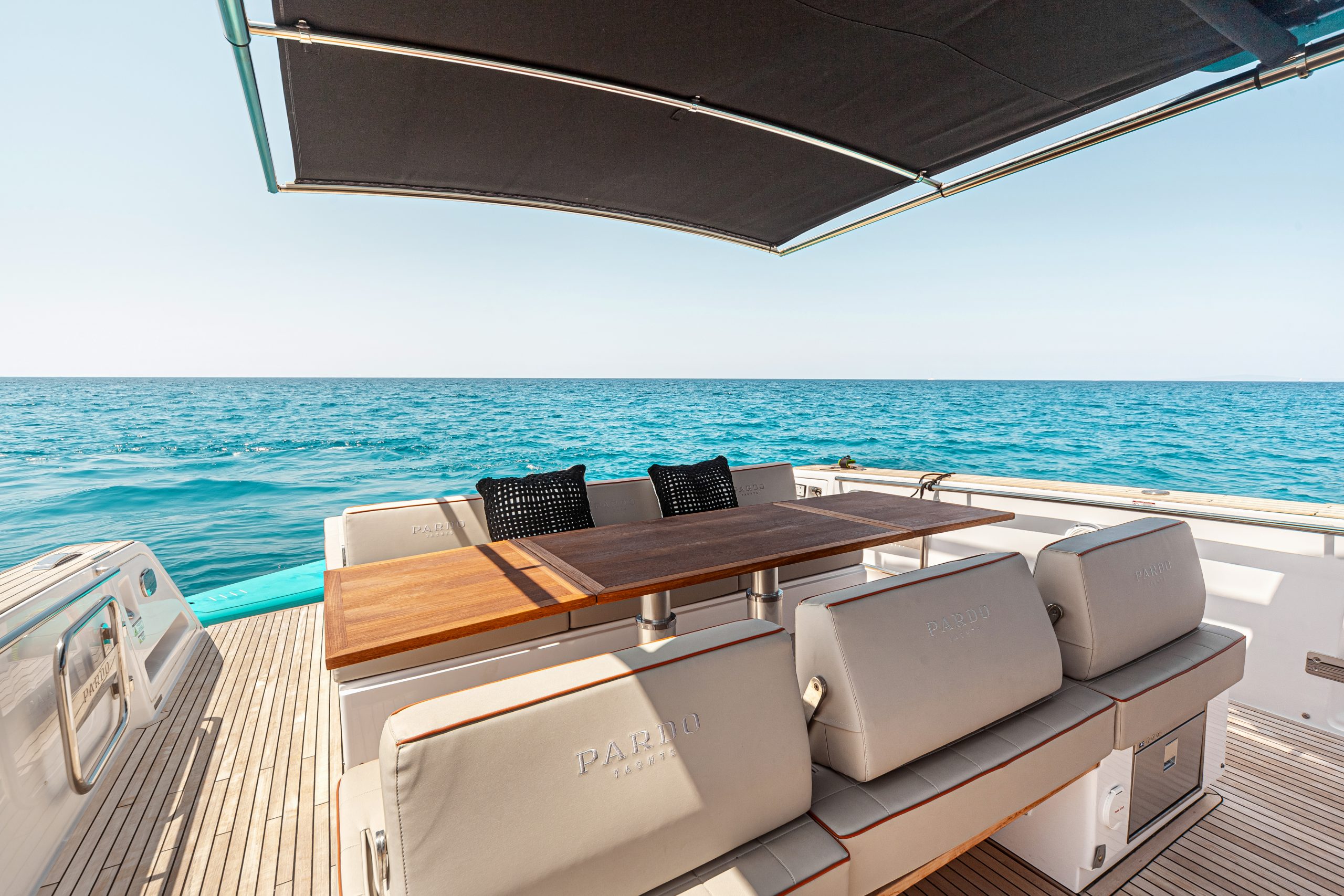 Le Pardo 43 se caractérise par son espace. Il dispose d’une cabine VIP et d’une cabine twin — chose rare pour un yacht de cette taille — ainsi que d’une salle de bain complète, climatisation avec générateur et chauffage, réfrigérateurs, machine à glaçons, cuisine entièrement équipée et possibilité d’annexe (tender).