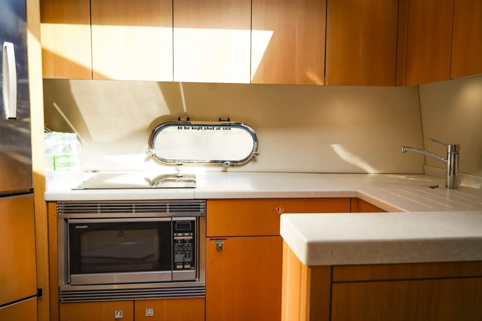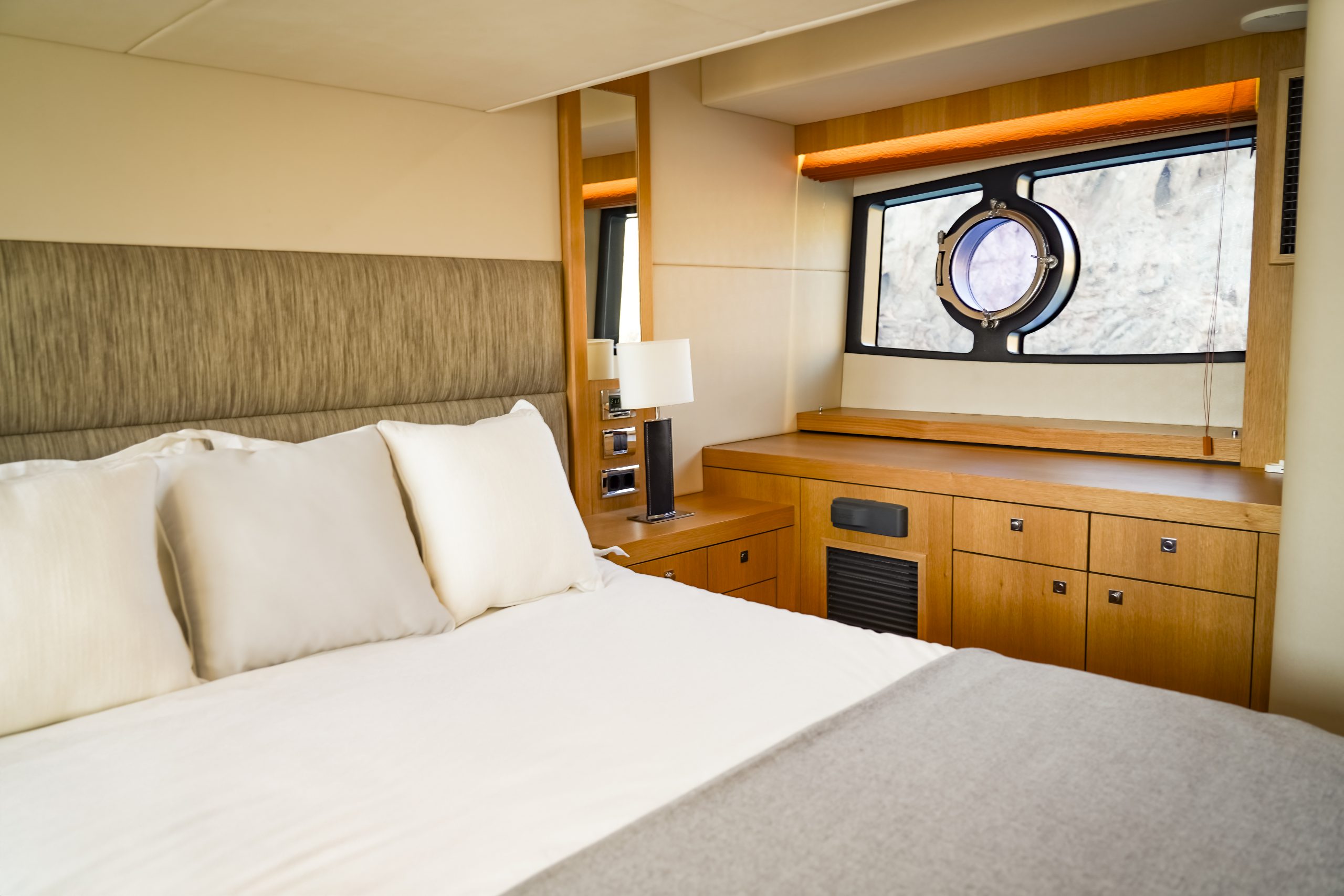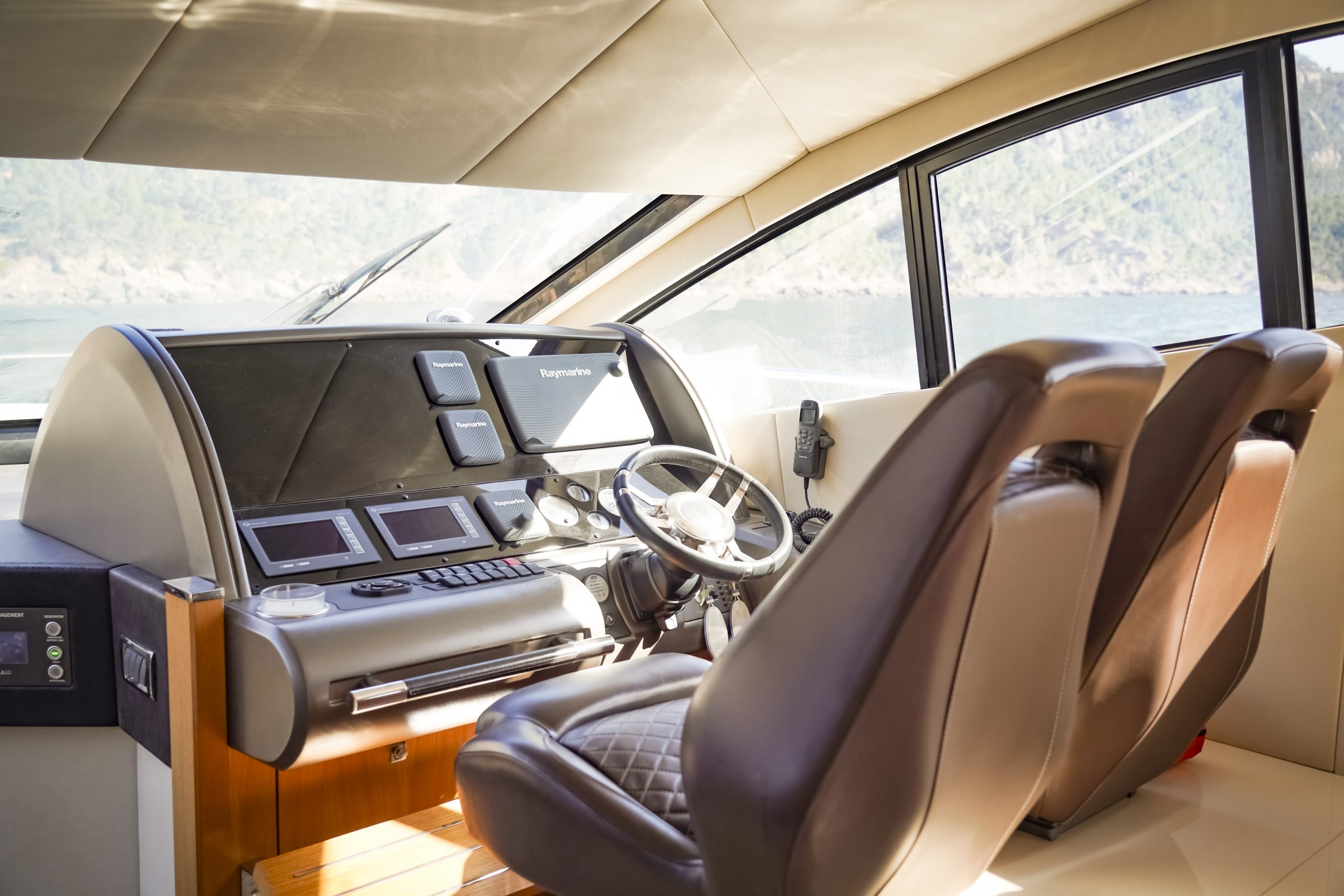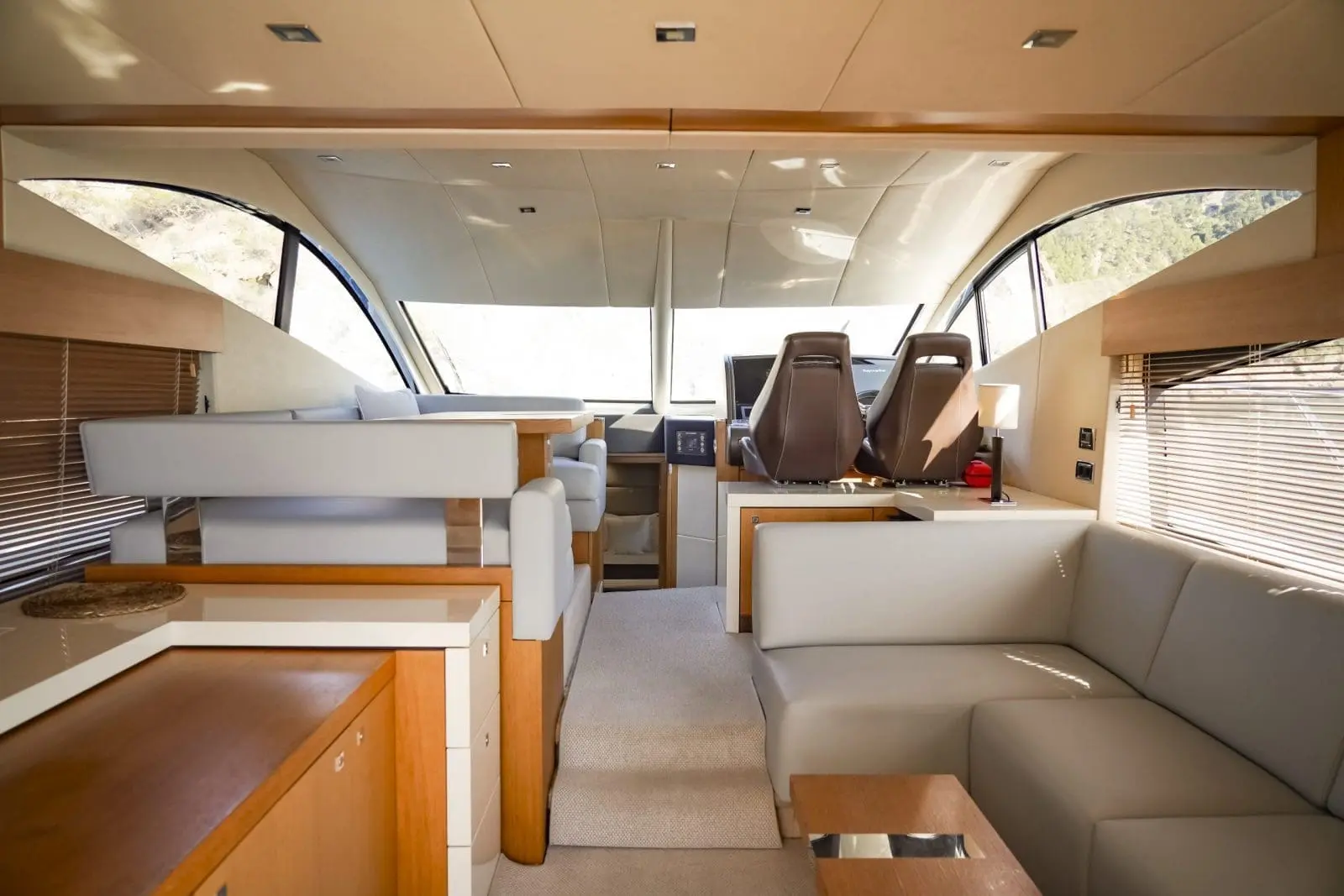 Il dispose d’un grand solarium à l’avant et de deux plus petits sur le flybridge et à l’arrière, d’un grand salon avec climatisation et chauffage, d’une capacité d’hébergement pour 6 personnes dans deux cabines doubles et une cabine twin, de réfrigérateurs, d’un congélateur, d’une cuisine complète et de systèmes audio.