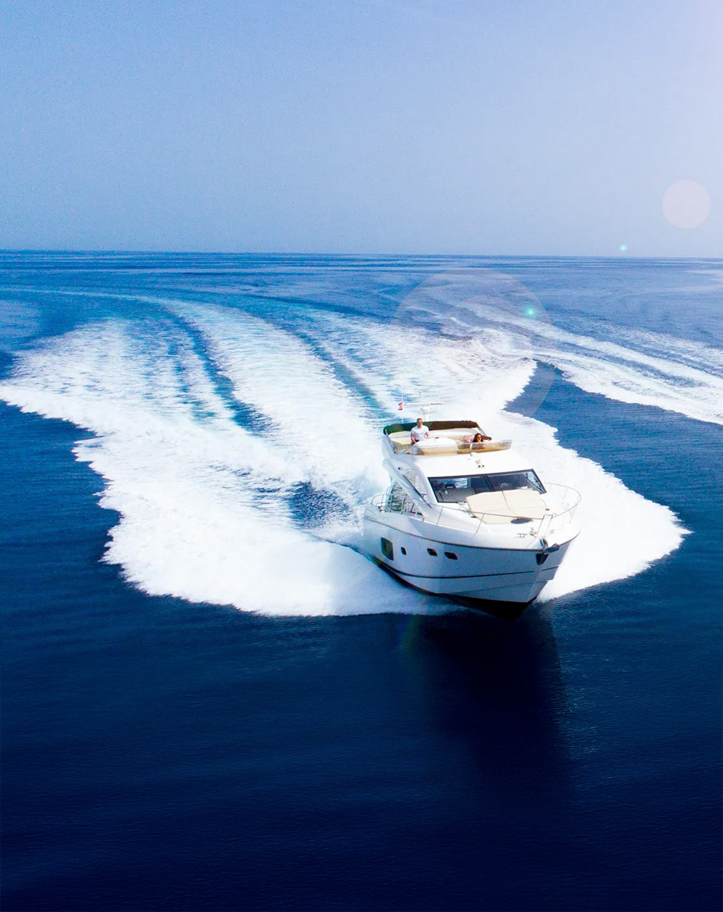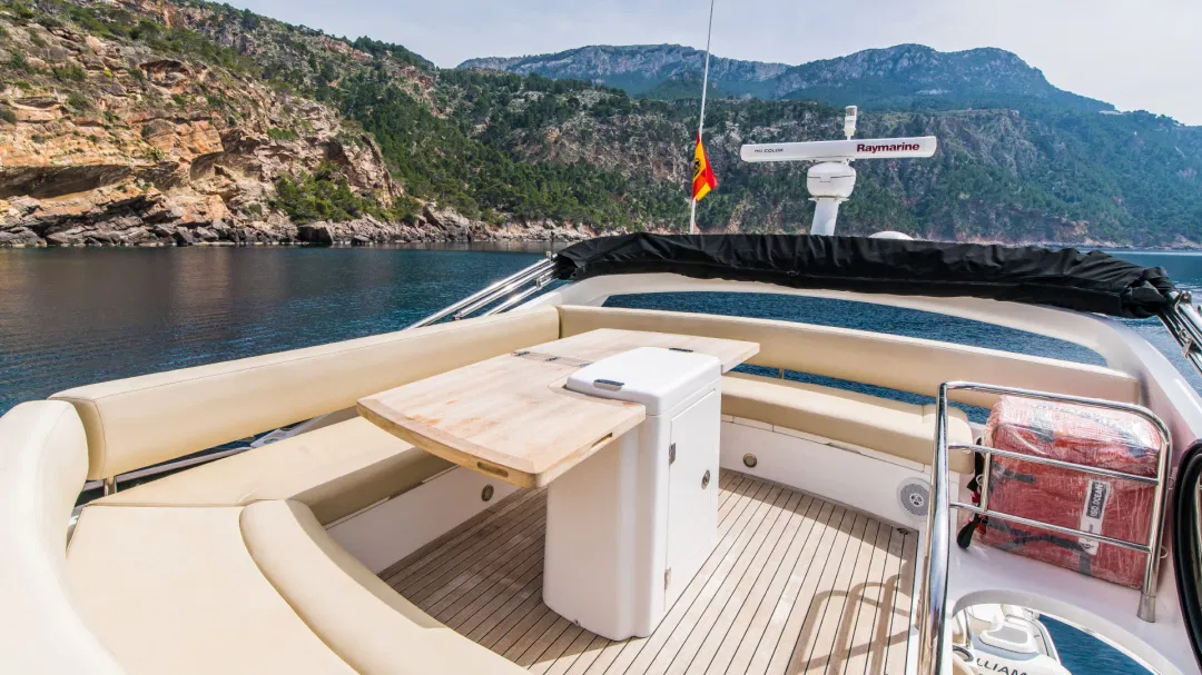 Il comprend un grand flybridge avec bimini où vous pourrez vous allonger ou vous asseoir avec vos proches et admirer l’impressionnante côte de Majorque depuis les hauteurs. Il dispose de deux salles de bain complètes, de réfrigérateurs, d’une cuisine entièrement équipée, de systèmes audio, d’un grand solarium à l’avant et d’un plus petit à l’arrière, ainsi que d’espaces pour s’asseoir et profiter des vues tout en découvrant des lieux insoupçonnés.